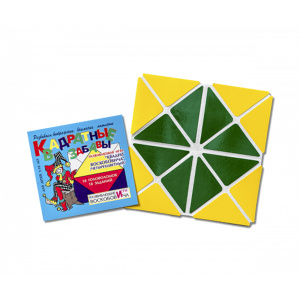 Рекомендуемый возраст 5-9 лет Состав На квадратную основу из ткани (140х140 мм) на некотором расстоянии друг от друга наклеены треугольники из плотного картона. Одна сторона «Квадрата» - зеленого и желтого цвета, другая – синего и красного. Цветные рисунки 18 сложенных фигур в книжечке «Квадратные забавы» (100х95 мм, цветная печать).