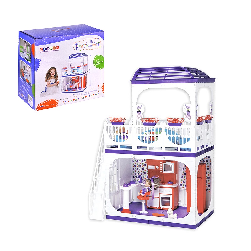 Домик для кукол - замечательный подарок для девочек. На первом этаже расположена удобная комната, на втором этаже - красивая веранда с крышей. На второй этаж можно подняться по ажурной белоснежной лестнице. На веранде куколки могут устраивать званные обеды, загорать или просто пить чай в компании своих любимых подруг. В набор входят яркие наклейки цветов, которые изысканно украшают веранду с двух сторон. Высота дома: 80 см. Яркая цветовая гамма мебели помогает маленьким принцессам сделать обстановку в домике на свой вкус. Кукла и мебель в набор не входят. Игрушка собирается ребёнком с помощью взрослого и предназначена для игры с куклами высотой до 30 см.