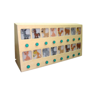 При нажатии на кнопку в первом ряду загорается изображение. Чтобы прозвучал голос животного, ребенок должен найти во втором ряду такую же картинку и нажать на кнопку под ней. Если соответствие выбрано неверно, изображение в верхнем ряду не светится и голос не воспроизводится.