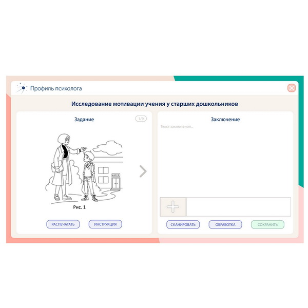 Тесты: Графическая методика «Кактус», Детский апперцептивный тест, Зрительно-моторный гештальт-тест Лоретты Бендер, «Изучение зрительной непроизвольной памяти», «Изучение зрительной произвольной памяти», «Корректурная проба для дошкольников», Методика «Волшебная страна чувств», Методика «Домик», Методика «Запоминание 10 слов», Методика «Запомни и расставь точки», Методика «Отгадывание загадок», Методика диагностики детских страхов и еще более 50 тестов.