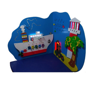 Предназначен для детей дошкольного и младшего школьного возраста. Состоит из двух игровых зон, которые можно располагать как под углом 90°, так и под 180° – на плоскую стену. Общая художественная тематика комплекса: тропический остров и синее море. Комплекс сочетает в себе множество развивающих элементов познавательной и развивающей направленности: движение по прорези Монтессори, интерактивные световые элементы, зажигающиеся от кнопок, открывающиеся замочки-крючки, надевание на штырьки, шестеренки, тактильные ячейки, где надо наощупь идентифицировать предмет.