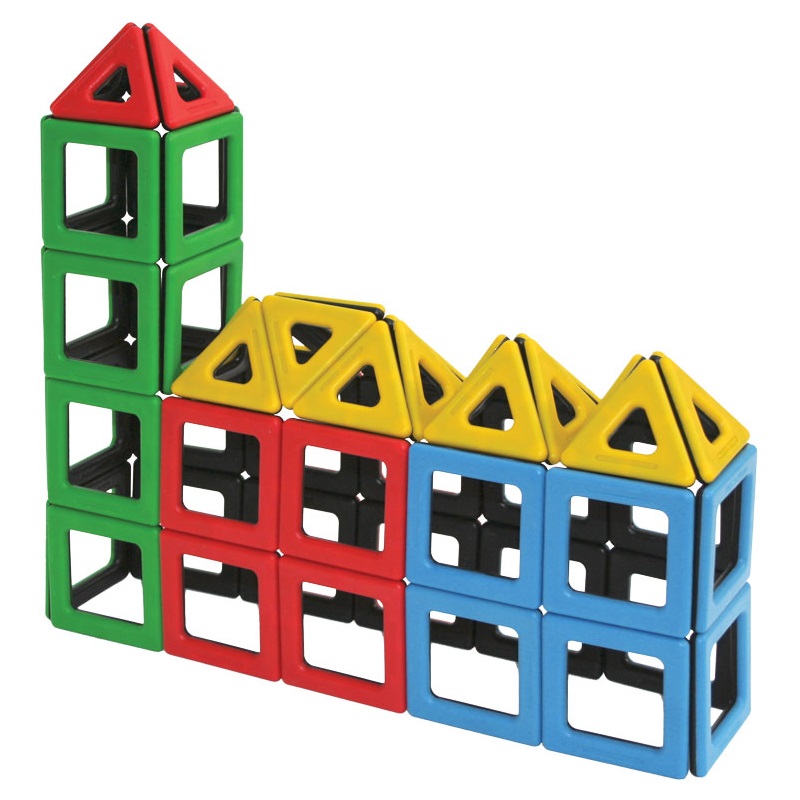 Магнитный конструктор, который состоит из квадратных и треугольных элементов необычной формы.