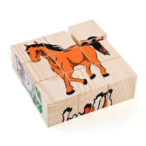 9 красочных кубиков с изображением домашних животных, которые нужно сложить в целую картинку. В изготовлении применена высококачественная древесина хвойных пород. Изображение нанесено методом шелкографии и очень износоустойчиво. Материалы разрешены для изготовления детских игрушек и имеют гигиенические заключения.