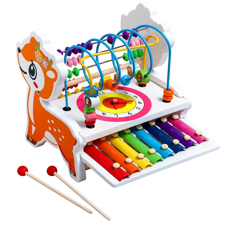 В наборе: металлофон, счёты, сортер, часы.