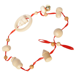 Игра-шнуровка развивает мелкую моторику рук, тактильные ощущения, познания форм, счет. На яркий шнурок нанизаны фигурки из неокрашенного (либо окрашенного) дерева.