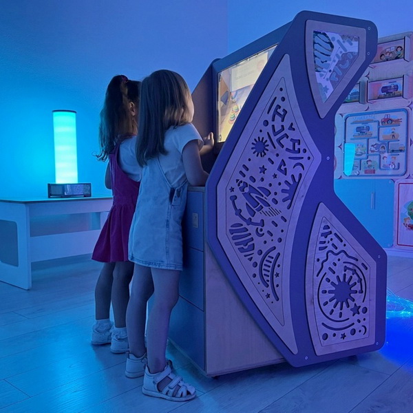 Эргономика «Иллюминара» продумана до мелочей: экран сенсорной панели располагается на удобной высоте для ребёнка, под сенсорной панелью три выдвижных ящика для игрушек и методического материала, на выступающей столешнице ящика можно рисовать, собирать конструктор, заниматься с дополнительным оборудованием, а можно облокотиться на столешницу, выполняя увлекательные задания на экране.