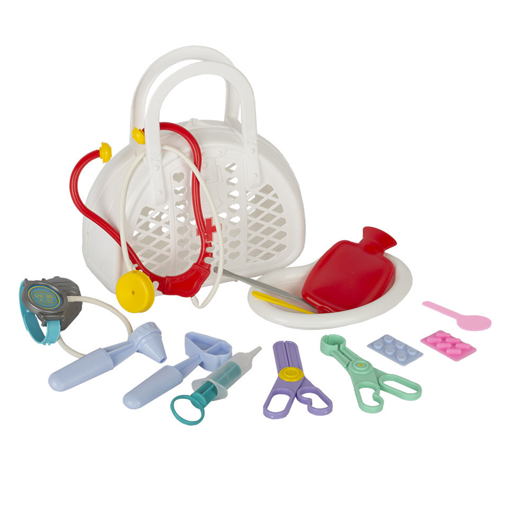 В наборе: сумка, ванночка, таблетки 2шт., шприц, щипцы, ножницы, скальпель, термометр, фонендоскоп, тонометр, молоток, ларингоскоп, лопатка окулиста, грелка, очки.
